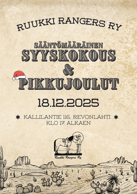 Tervetuloa Ruukki Rangers ry:n sääntömääräiseen syyskokoukseen sekä pikkujouluihin Revon Ranchille (Kallilantie 116, 92350 Revonlahti) 18.12.2025 klo 17 alkaen. Esityslista ohessa. Otathan yhteyttä sähköpostitse, mikäli haluat lisätä asioita esityslistalle (ruukki.rangers@gmail.com) tai hallituksen jäsenten kautta. Mikäli haluat osallistua Teams yhteydellä, pyydäthän liittymislinkin sähköpostitse etukäteen.